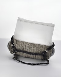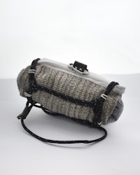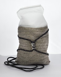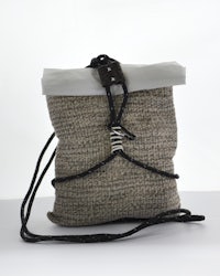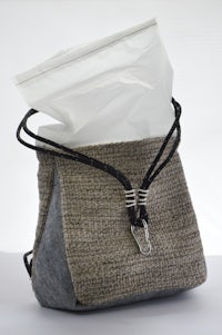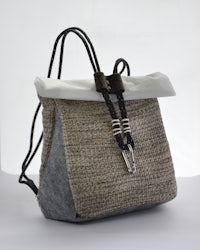 Le tissage simple en fils de coton recyclé a été assemblé en couture avec du feutre synthétique ainsi que des pans de tissu plastique (récupérés sur une housse).